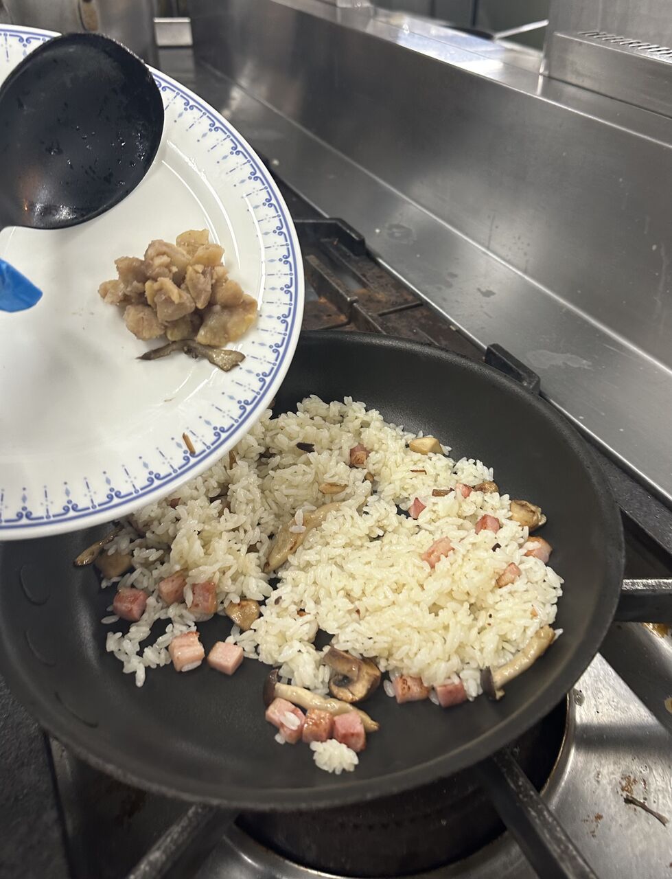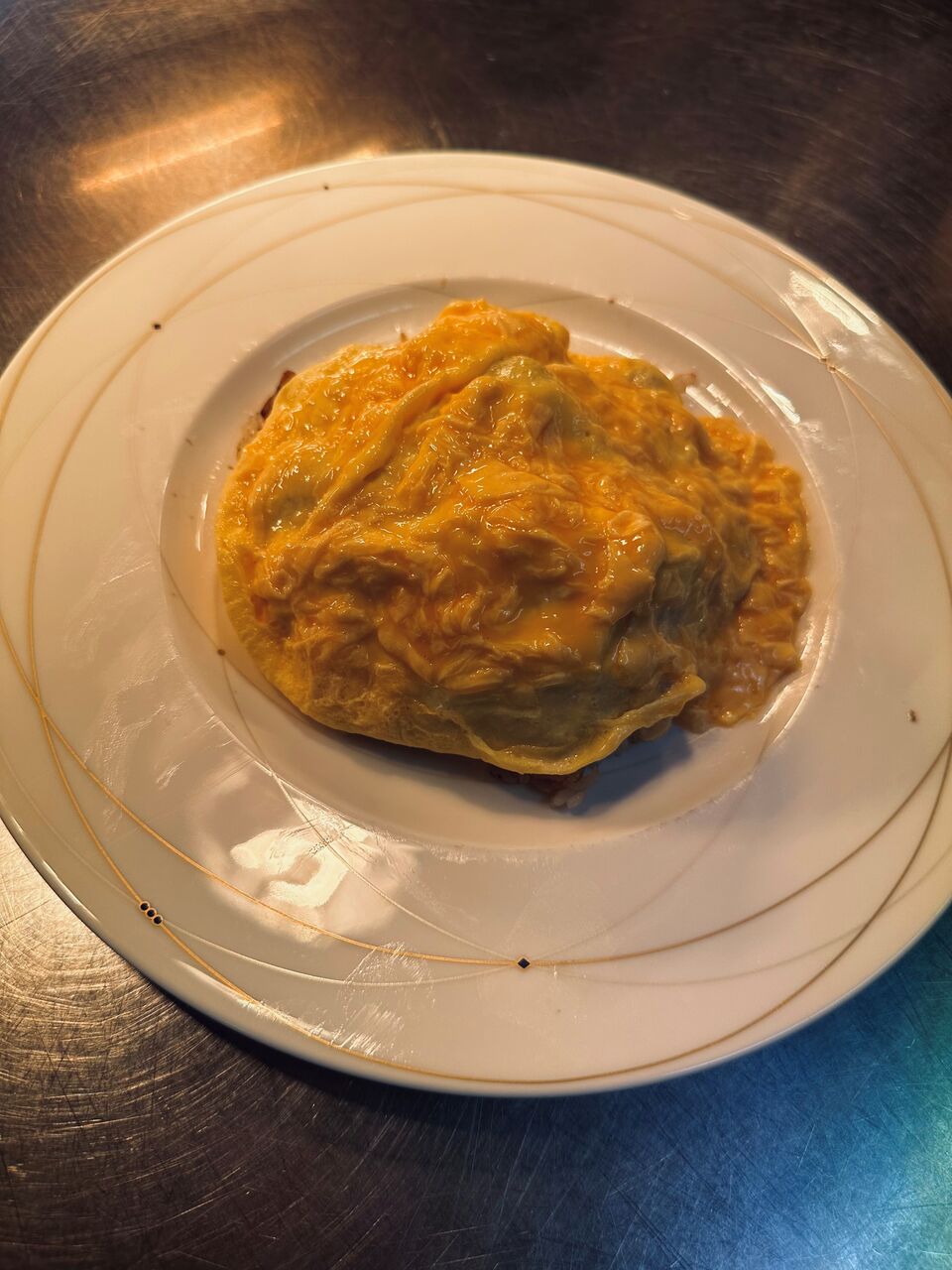 ふわふわ焼き立ての卵をピラフの上にかぶせたら、完成は目の前