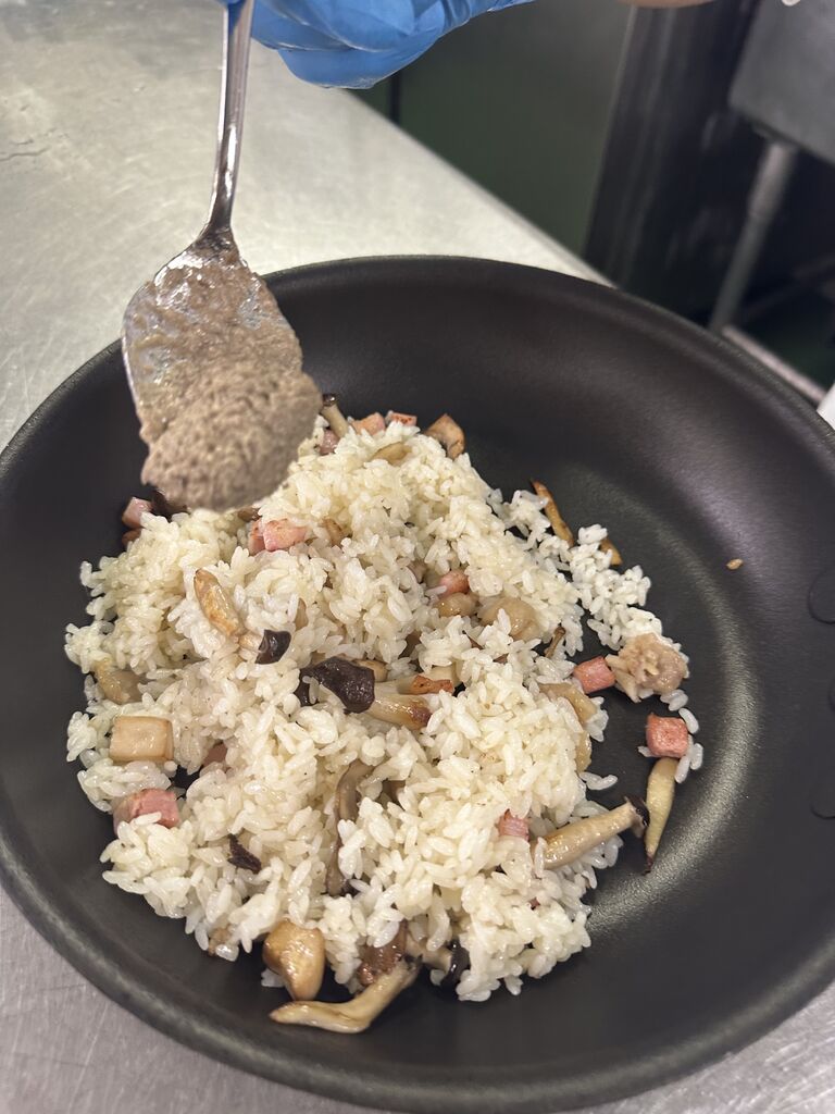 きのこペーストをよく加えて、さらに炒めて味をなじませていきます