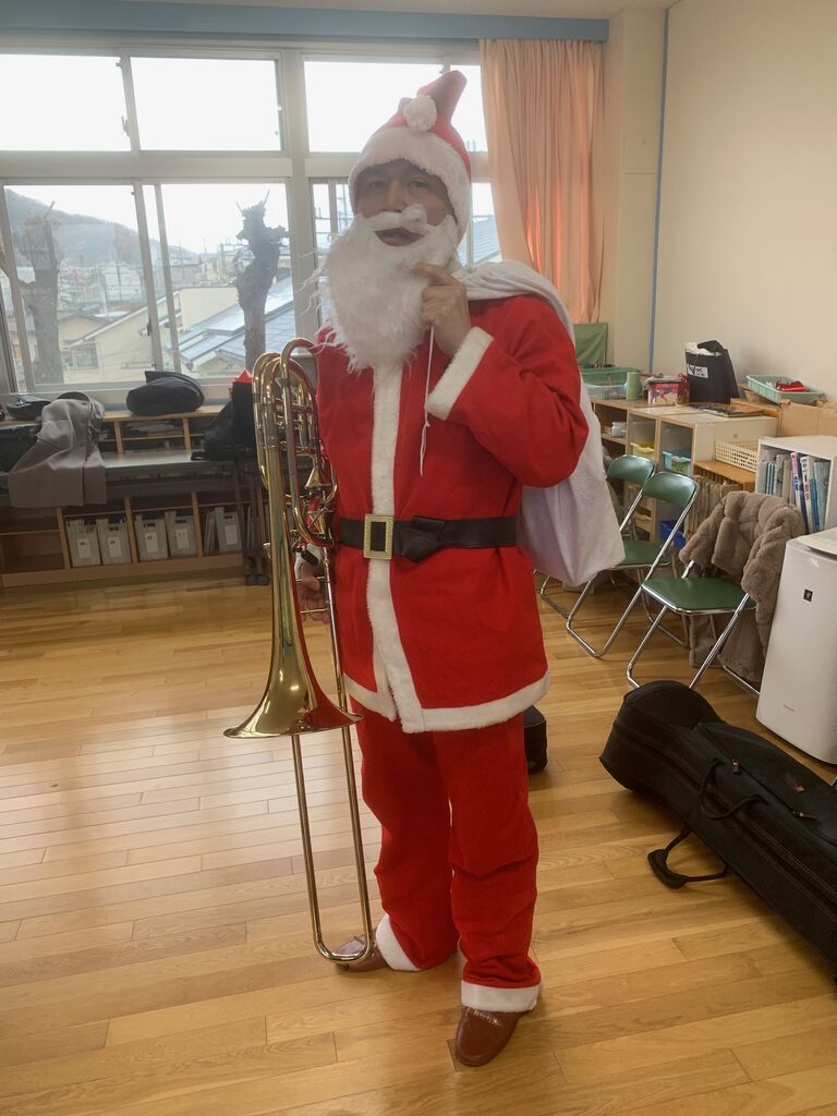 クリスマスシーズンにはサンタに扮して幼稚園に演奏に行かれるそうです