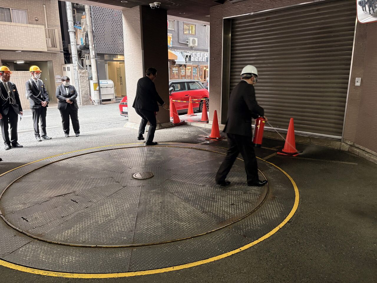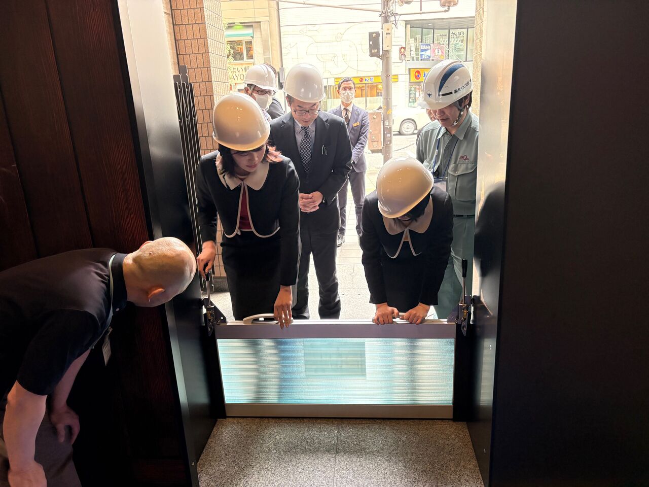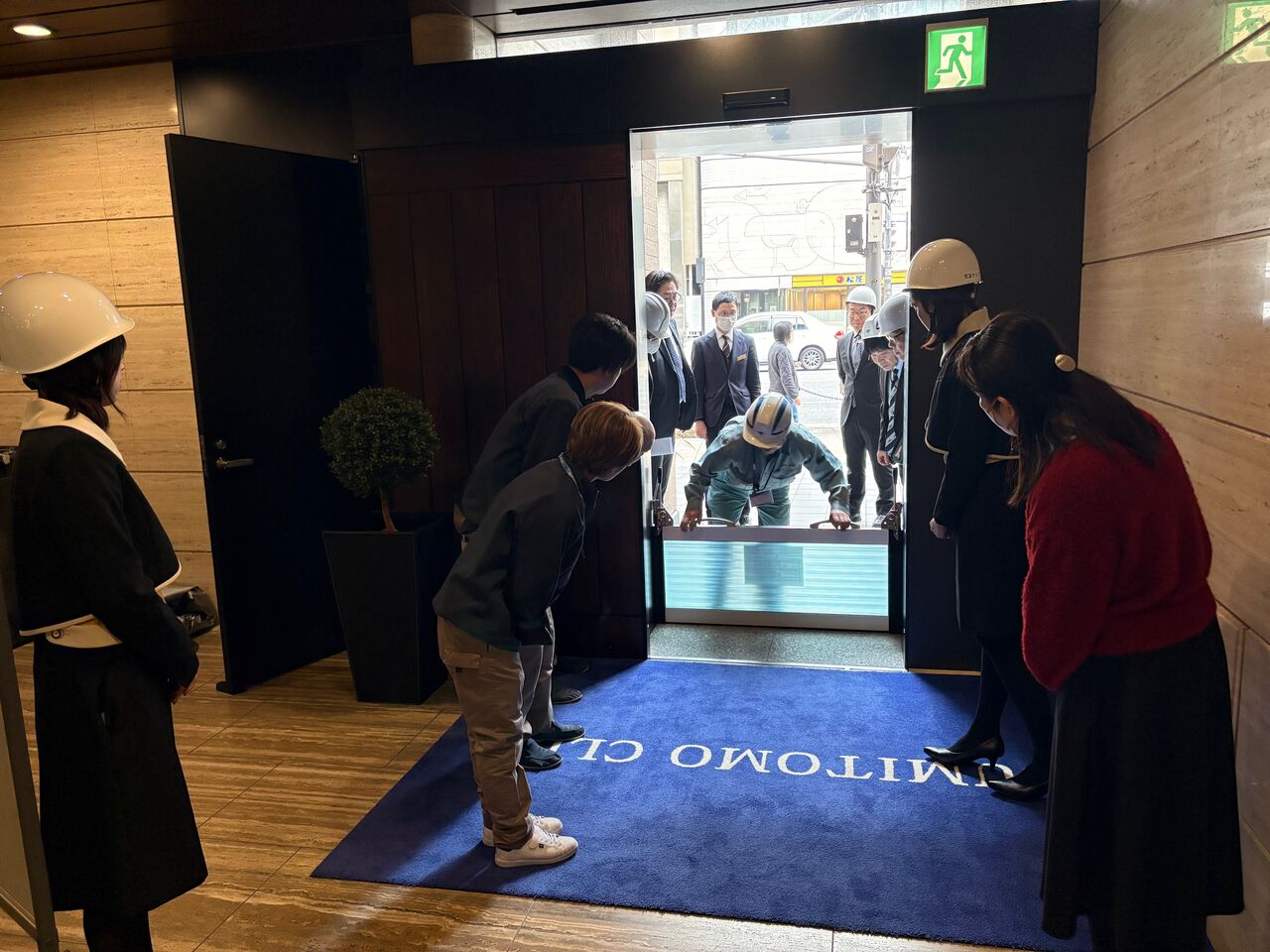 先日、ビルのオーナーである住友成泉様が住友クラブエントランスに設置できる防潮板を購入してくださったので、全員で改めて設置方法を学びました!
