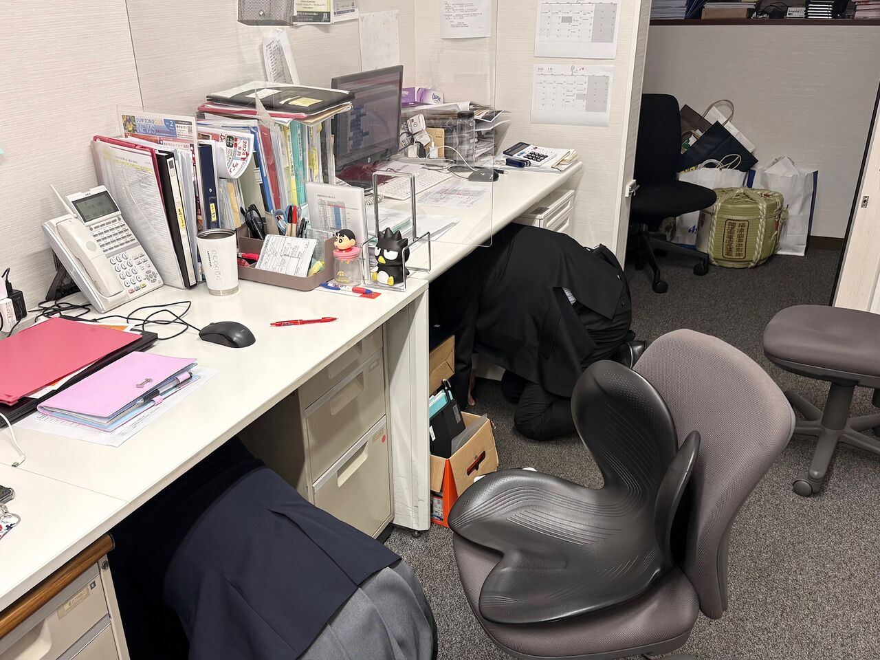 地震がおさまったらヘルメットを装着しその場待機、余震に備えます。